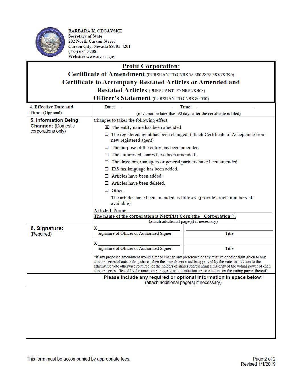 | 7. | To approve a certificate of amendment to our Amended and Restated Articles of Incorporation (the “Articles of Incorporation”) changing our name to NextPlat Corp. | |