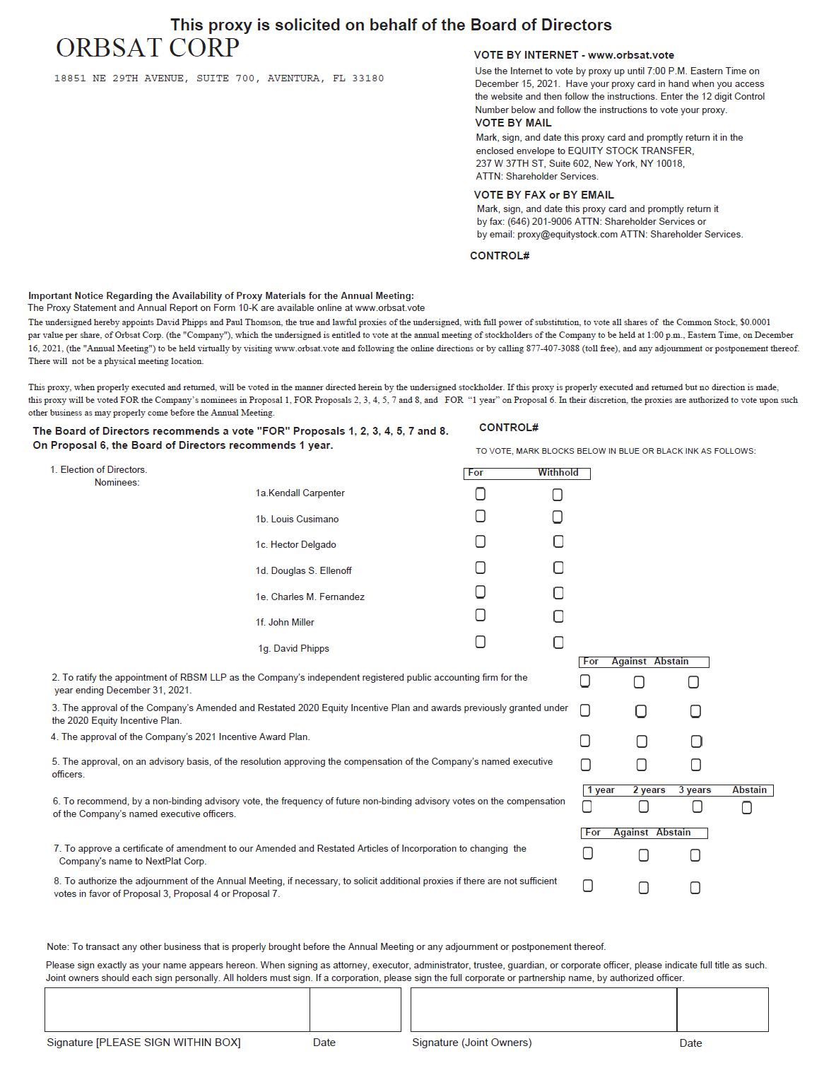 Only stockholders of record of the Company at the close of business on October 22, 2021 (the “Record Date”), are entitled to notice of and to vote at the Annual Meeting or any adjournment or postponement thereof. A complete list of these stockholders will be open for the examination of any stockholder of record at the Company’s principal executive offices located at 18851 N.E. 29th Ave., Suite 700, Aventura, FL 33180 for a period of ten days prior to the Annual Meeting. The list will also be available for the examination of any stockholder of record present at the Annual Meeting. The Annual Meeting may be adjourned or postponed from time to time without notice other than by announcement at the meeting. This Notice of Annual Meeting of Stockholders and proxy statement, along with a proxy card, was first mailed on or about _________, 2021 to our stockholders of record as of the Record Date. These materials and our Annual Report on Form 10-K for the year ended December 31, 2020 are also available electronically at www.orbsat.vote.