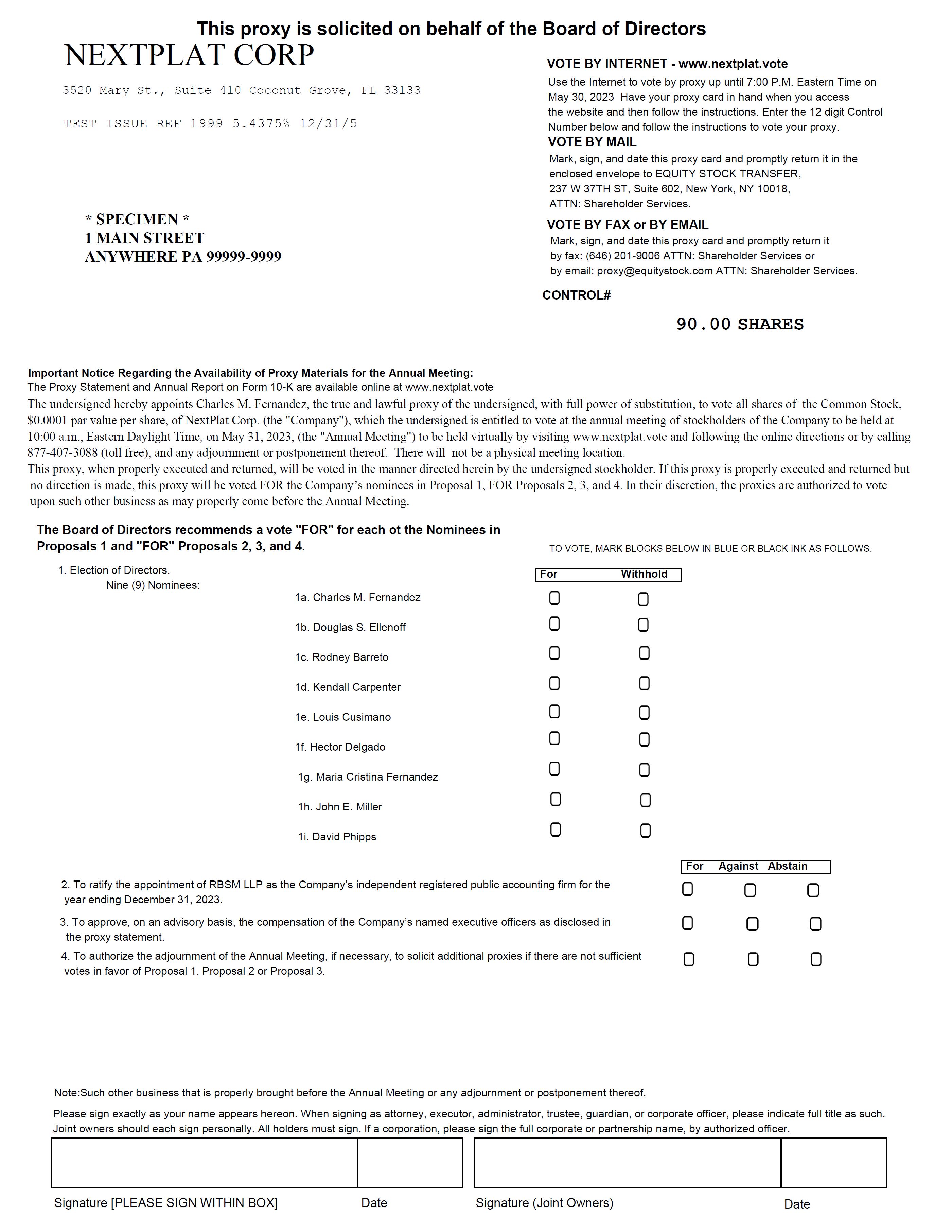 Only stockholders of record of the Company at the close of business on April 3, 2023 (the “Record Date”), are entitled to notice of and to vote at the Annual Meeting or any adjournment or postponement thereof. A complete list of these stockholders will be open for the examination of any stockholder of record at the Company’s principal executive offices located at 3520 Mary St., Suite 410, Coconut Grove, FL 33133 for a period of ten days prior to the Annual Meeting. The list will also be available for the examination of any stockholder of record present at the Annual Meeting. The Annual Meeting may be adjourned or postponed from time to time without notice other than by announcement at the meeting. This Notice of Annual Meeting of Stockholders and proxy statement, along with a proxy card, was first mailed on or about April 21, 2023 to our stockholders of record as of the Record Date. These materials and our Annual Report on Form 10-K for the year ended December 31, 2022 are also available electronically at www.nextplat.vote.